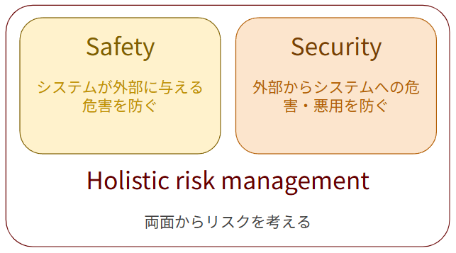 端的にまとめると、SafetyとSecurityという2つの観点があれそれぞれに歴史があるが、AIに関しては、これらを統合(Holistic)したリスクフレームワークを考えていく必要があるので、専門家同士手を取り合いましょう、という話。